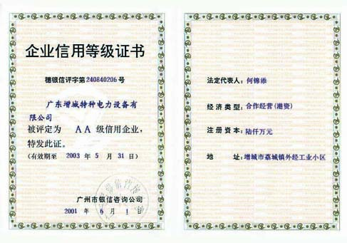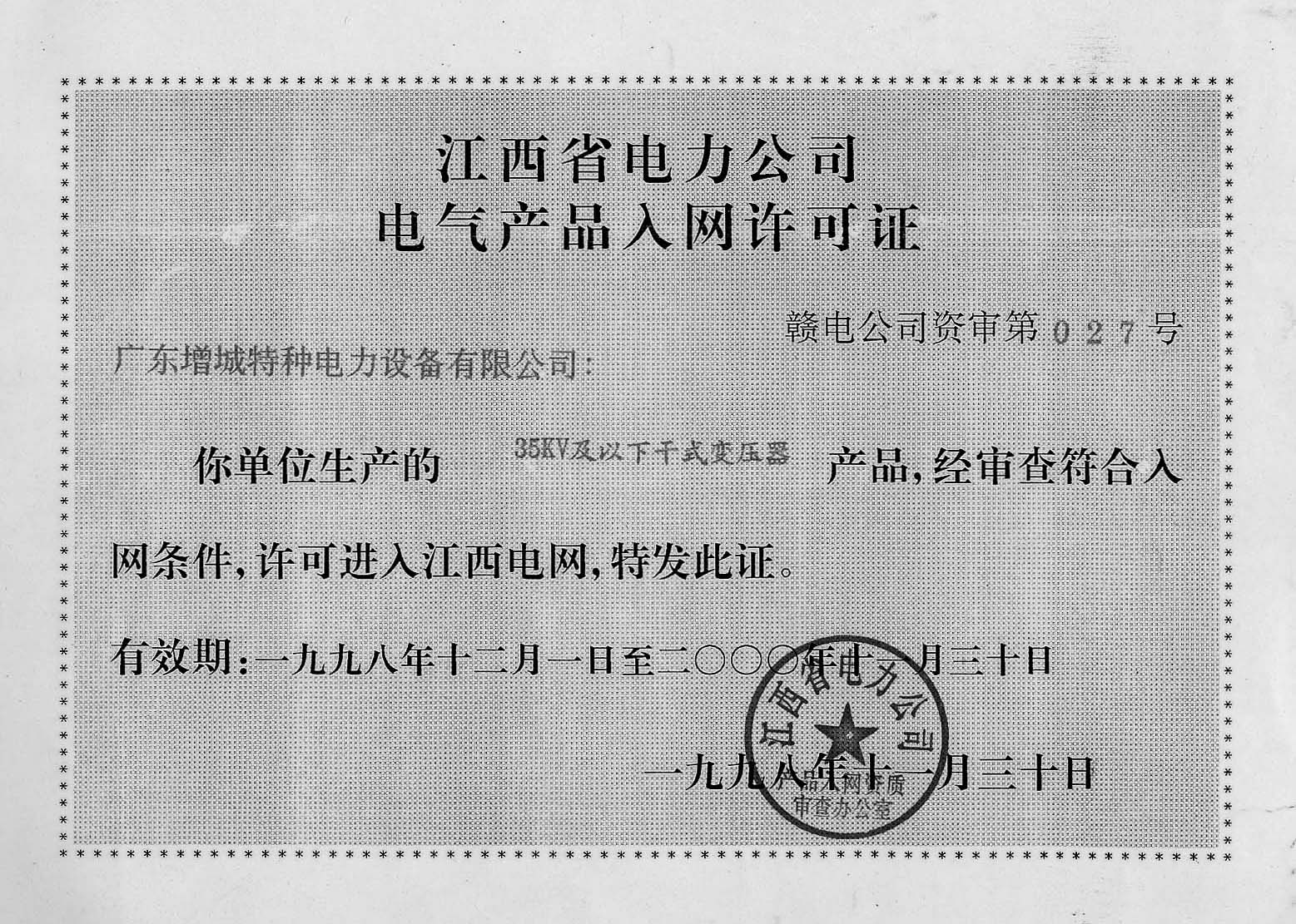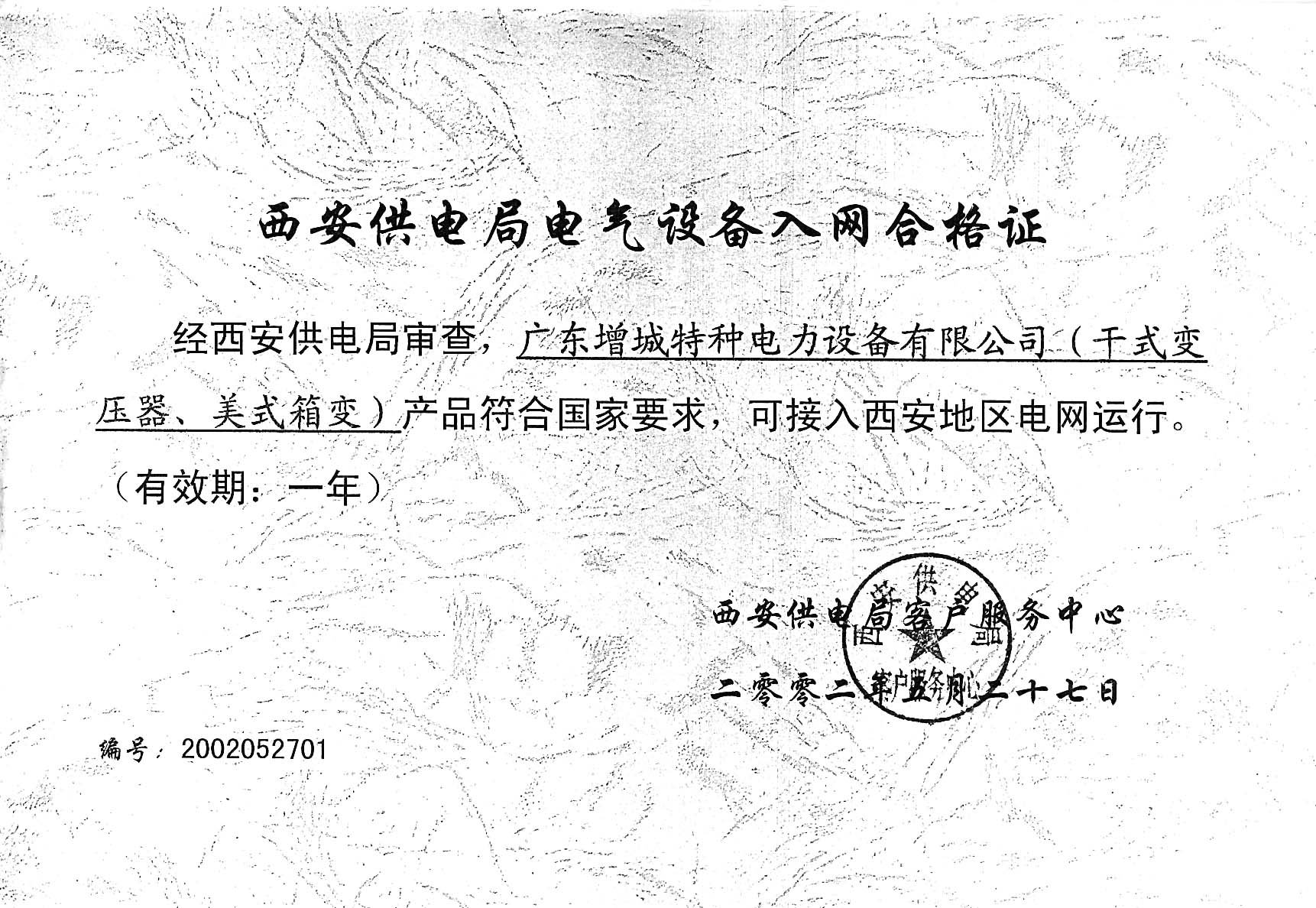 西安供電局電氣設(shè)備入網(wǎng)合格證