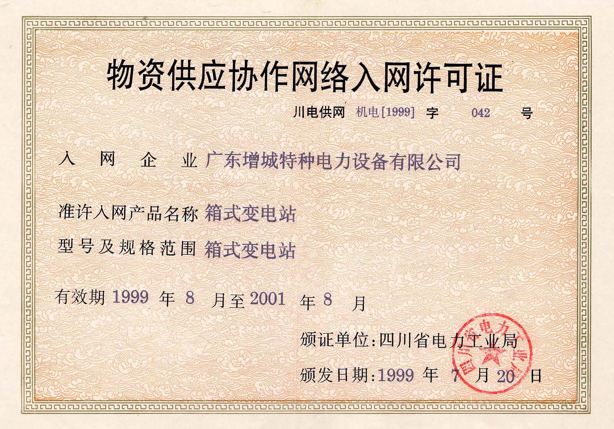 四川省電力工業(yè)局箱式變電站物資供應(yīng)協(xié)作入網(wǎng)許可證