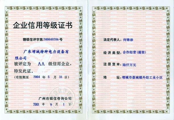 廣州增銀電力設(shè)備有限公司    榮譽(yù)證書