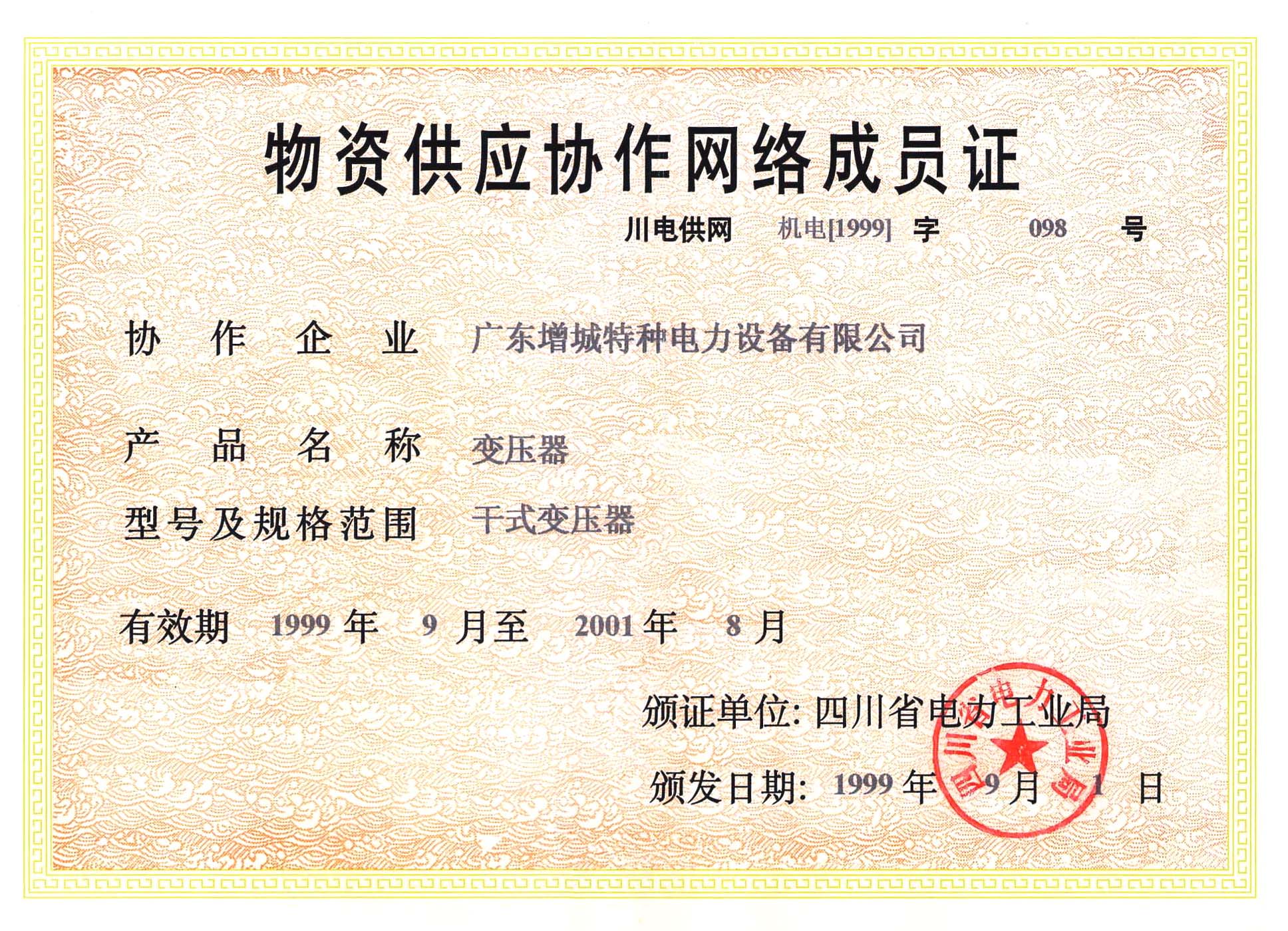 四川省電力工業(yè)局干式變壓器物資供應(yīng)協(xié)作入網(wǎng)許可證