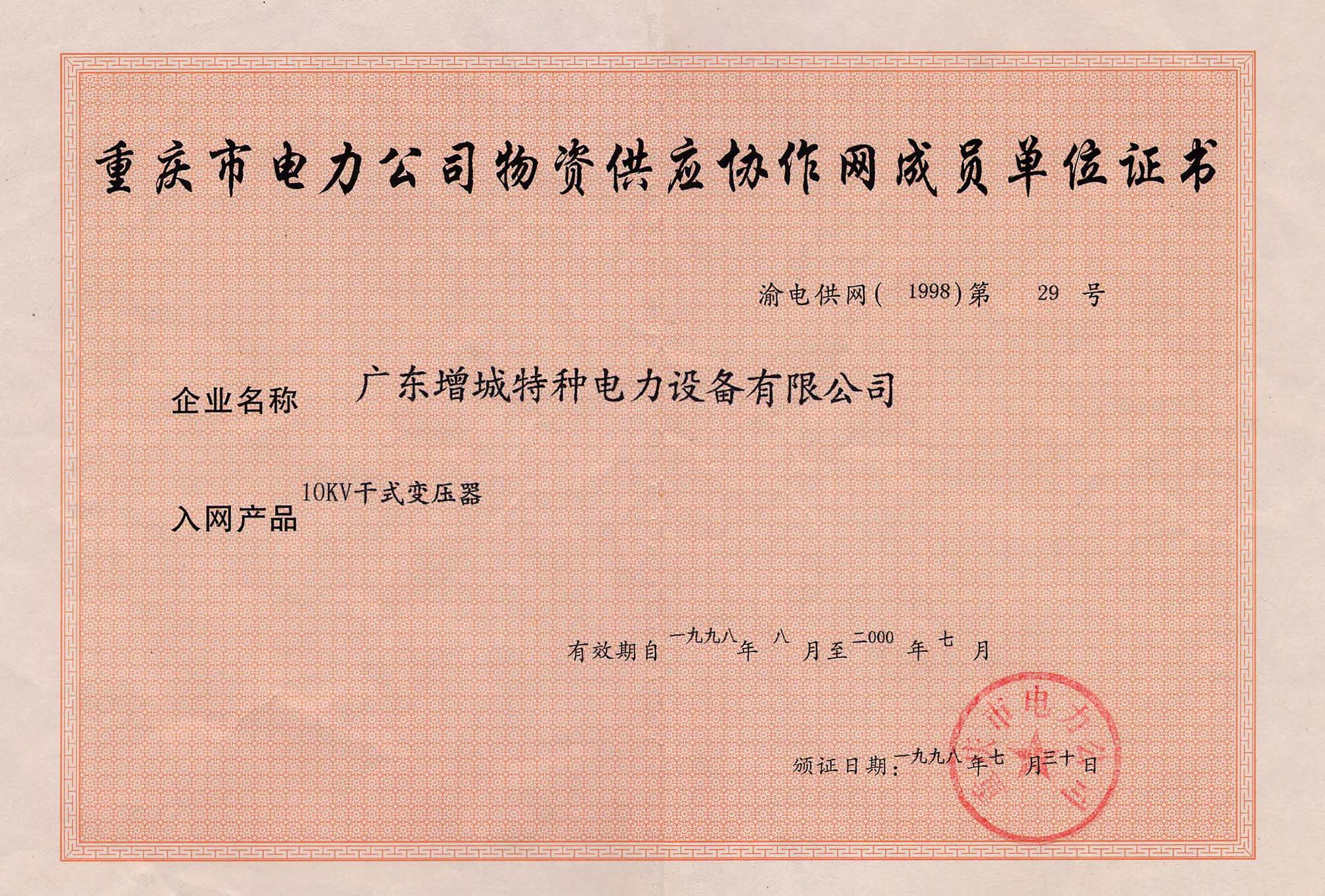 重慶市電力公司物資供應協(xié)作網(wǎng)成員單位證書