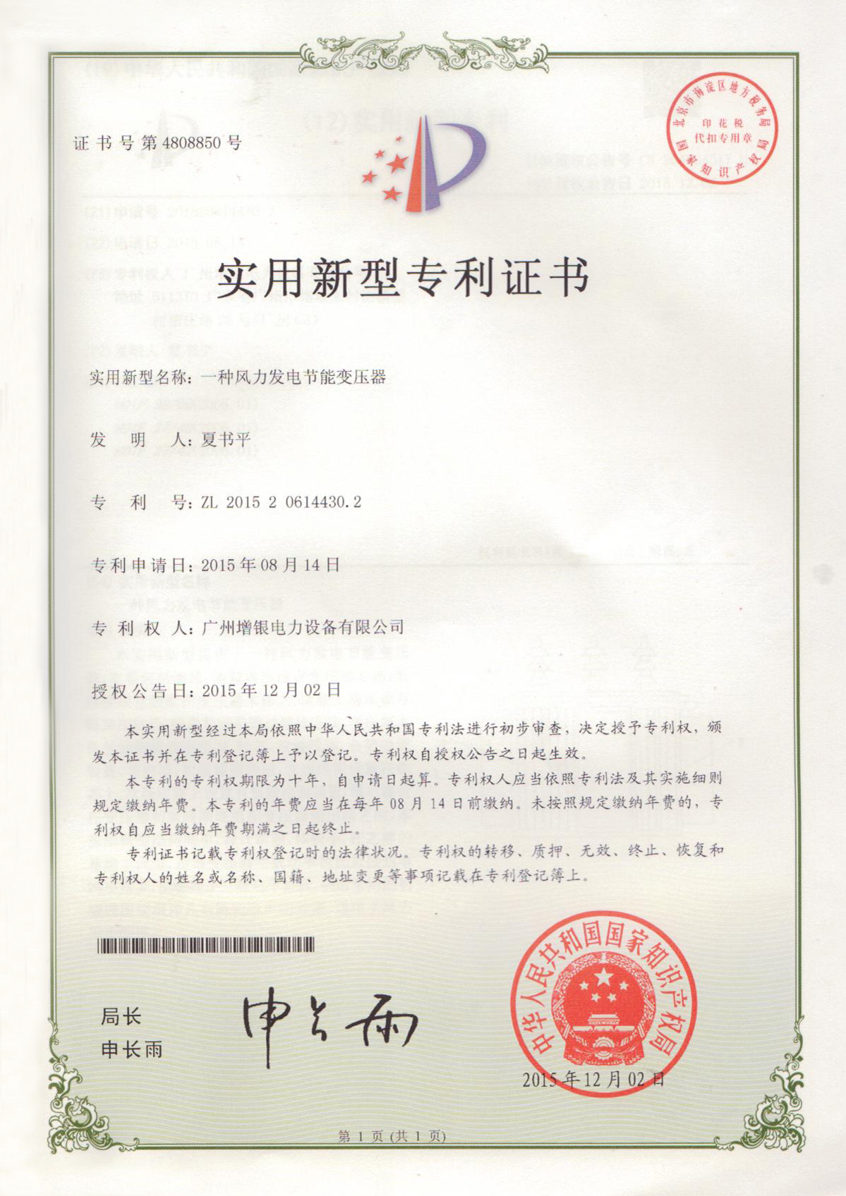 一種風力發(fā)電節(jié)能變壓器專利證書