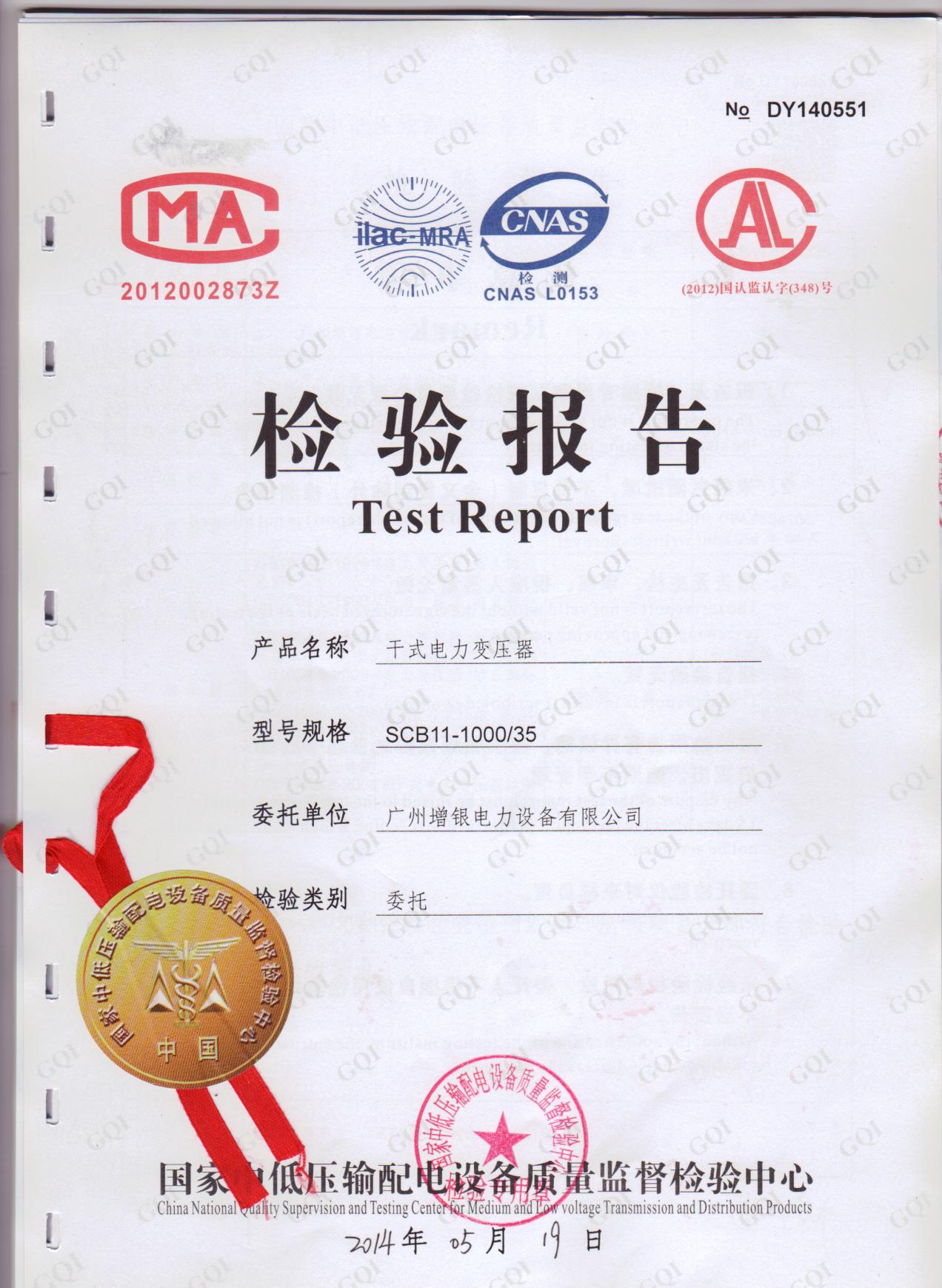 我公司送檢的SCB11-1000/35-0.4干式變壓器一次性通過國(guó)家質(zhì)量監(jiān)督檢驗(yàn)中心各項(xiàng)性能檢測(cè)。