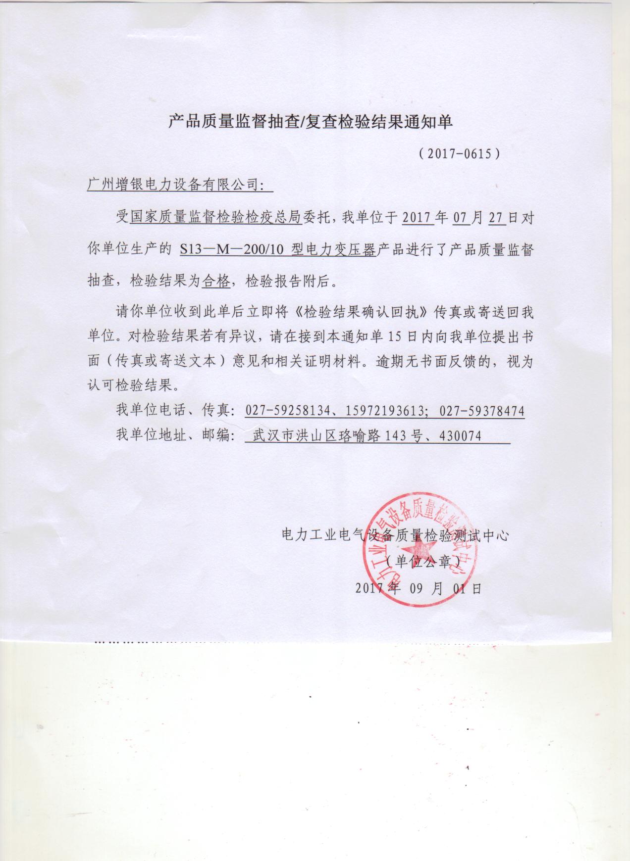 2017年9月,我公司生產(chǎn)“S13-M-200/10型電力變壓器”通過(guò)了國(guó)家產(chǎn)品質(zhì)量監(jiān)督的抽查。